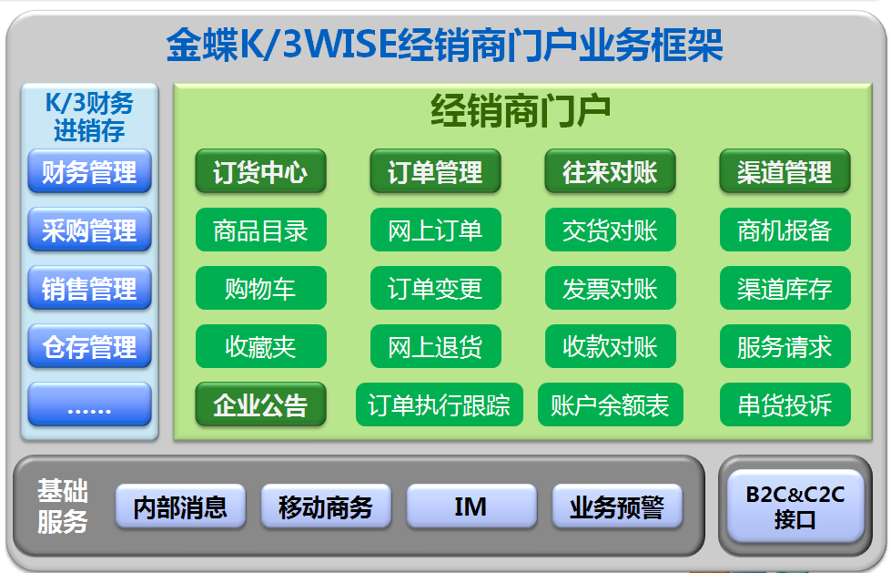 金蝶經(jīng)銷商管理解決方案 經(jīng)銷商管理系統(tǒng)主要以K/3WISE經(jīng)銷商門戶模塊為主,介紹經(jīng)銷商如何通過經(jīng)銷商門戶進行溝通、訂貨、退貨、對賬等,形成金蝶K/3WISE經(jīng)銷商門戶解決方案。 適用企業(yè) 具有完整的經(jīng)銷商網(wǎng)絡,希望提高經(jīng)銷商綜合管理水平,完善經(jīng)銷商業(yè)務的企業(yè) 企業(yè)特征 經(jīng)銷商訂貨量大,希望通過更快捷的方式下訂單 經(jīng)銷商希望能實時了解訂單狀態(tài) 經(jīng)銷商希望了解企業(yè)庫存,以免出現(xiàn)下單無貨的情況 供求雙方對賬業(yè)務繁雜,希望能方便快捷的處理對賬 企業(yè)希望能有效分析管理經(jīng)銷商庫存 適用行業(yè) 電子、機械、家電、五金等制造行業(yè)均可